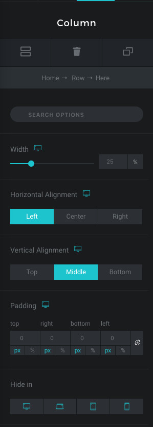 Header Column is housed within the Row. The layout of the Header Column can be switched while adding a row, or even after that by navigating to the Column Switcher. Settings of a Header Column can be modified using the options present in the left panel. The options present for a Header Column are explained below.