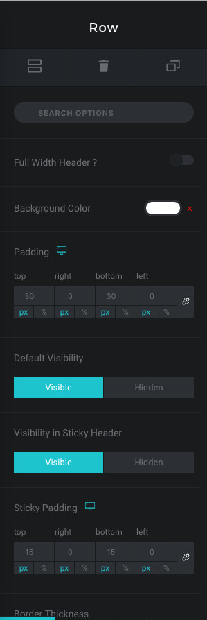 Click on the Header Row in the Right Panel to edit the Settings of the Row. Settings will be listed in the Left Panel. Each of the Settings are explained below –
