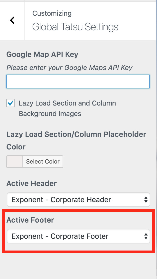 Editing the Active Footer – At once only one Footer can be active. The Footer that is currently visible on your site is the Active Footer. It can be edited by clicking on the TATSU FOOTER BUILDER link in the admin panel.